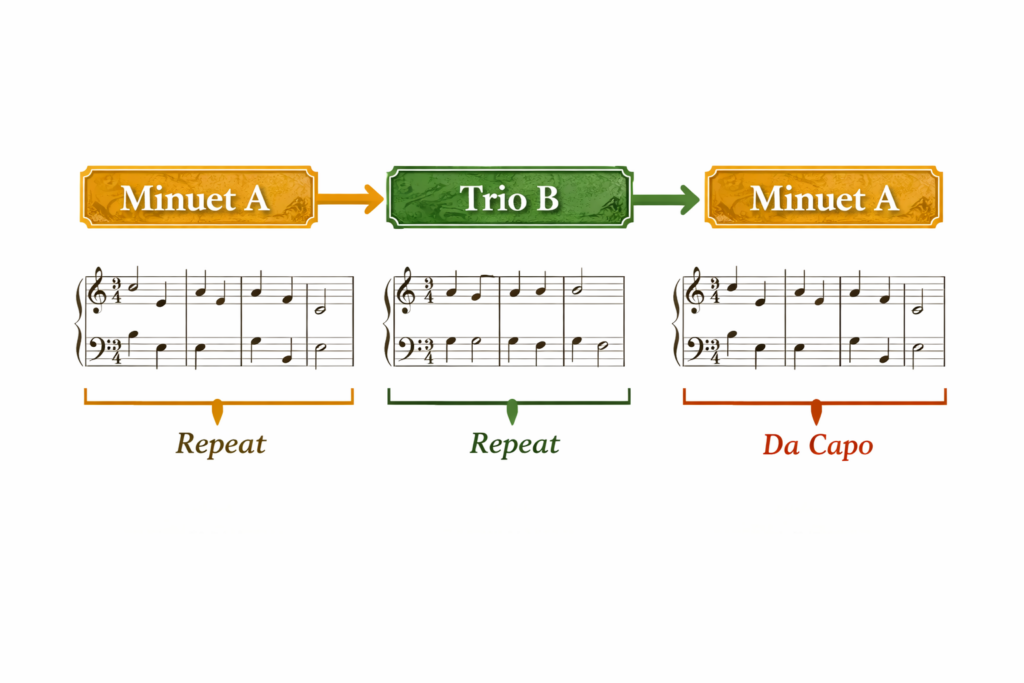 The first minuet presents the main material. The trio then follows, offering contrast—often through a lighter texture, different key, or smoother melodic style. After the trio, the original minuet returns, usually without repeats.